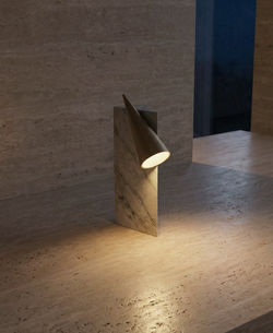 Table lamp characterized by essential lines and rich material. It is designed by a composition of radical volumes sublimated by noble materials. The conic lampshade remains magically suspended creating a slight asymmetry, like a light metallic accent placed on the marble block.