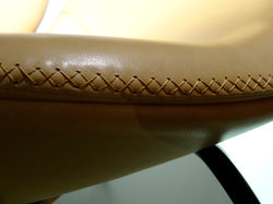 The seat is modelled to draw the arms, while the wide back looks simply laid in balance.